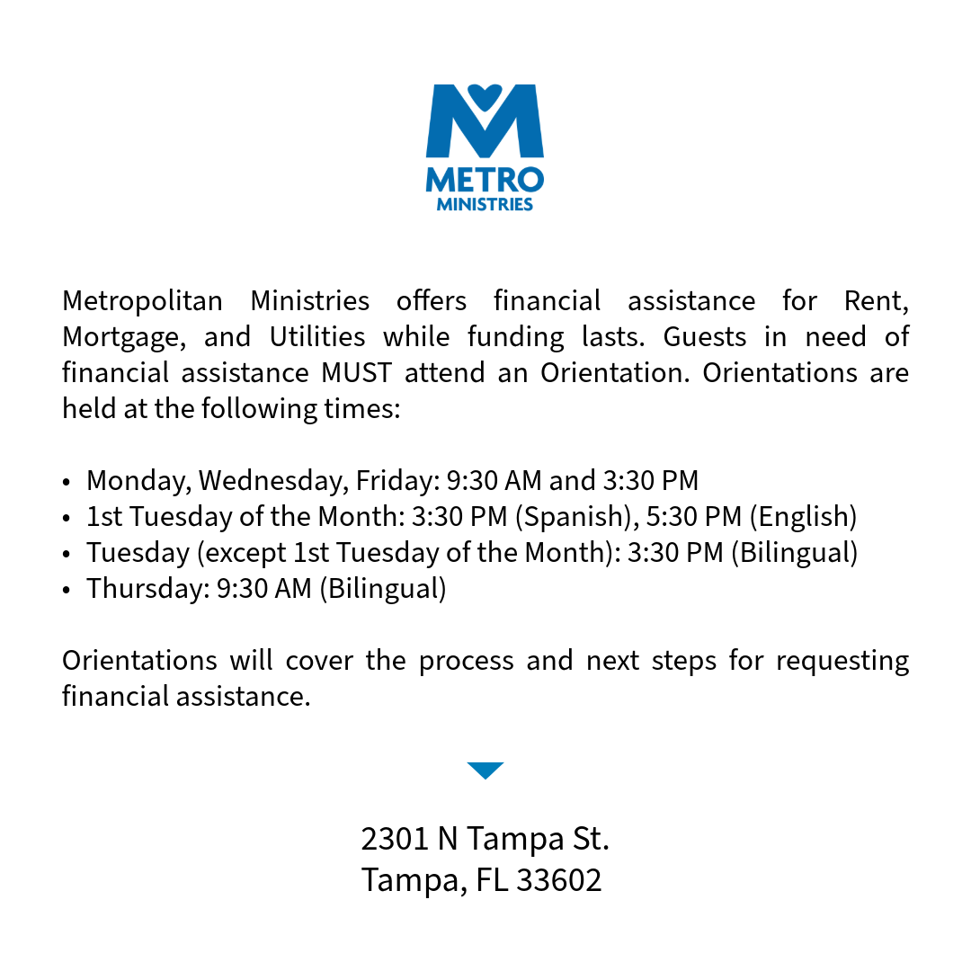 Metropolitan Ministries operates Family Support Centers and additional locations offering Financial Assistance in Hillsborough County.