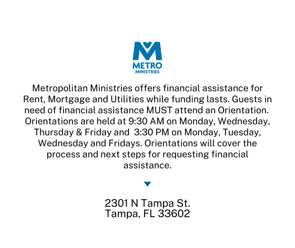 Metropolitan Ministries offers financial assistance on a daily first-come-first-served basis with rent, mortgage, and utilities while funding lasts. Not all inquiries will qualify. All applications require proof of financial hardship, including documented loss of employment, furlough, reduction of hours, or approved unemployment applications. Only one application per household (addresses are verified) is permitted.